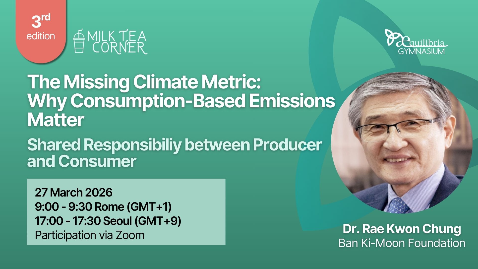 Our guest speaker, Rae Kwon Chung, Member of the Board of Directors at the Ban Ki-moon Foundation, will guide us through this perspective, helping us reflect on how global supply chains shift emissions across borders and reshape responsibility.